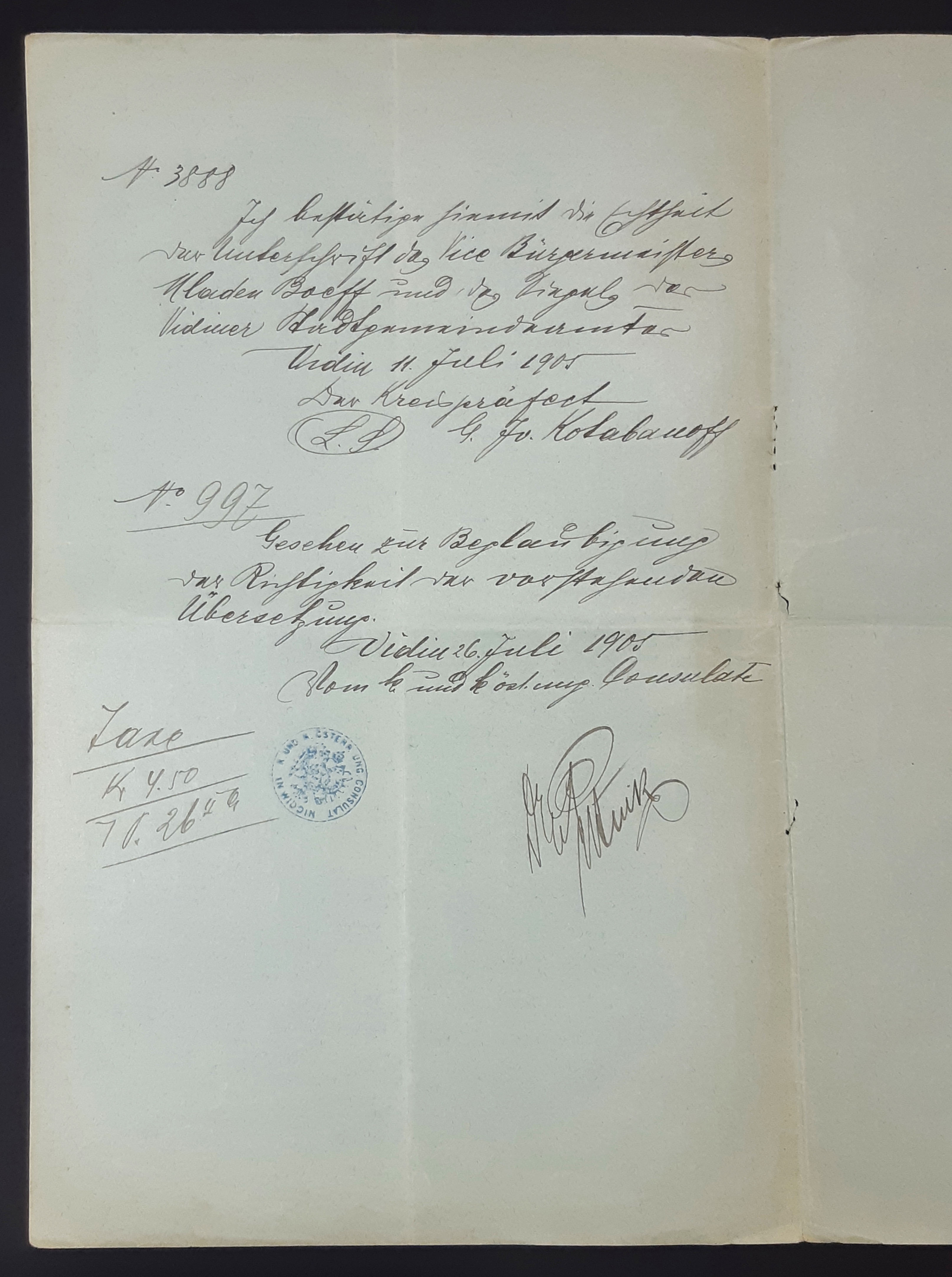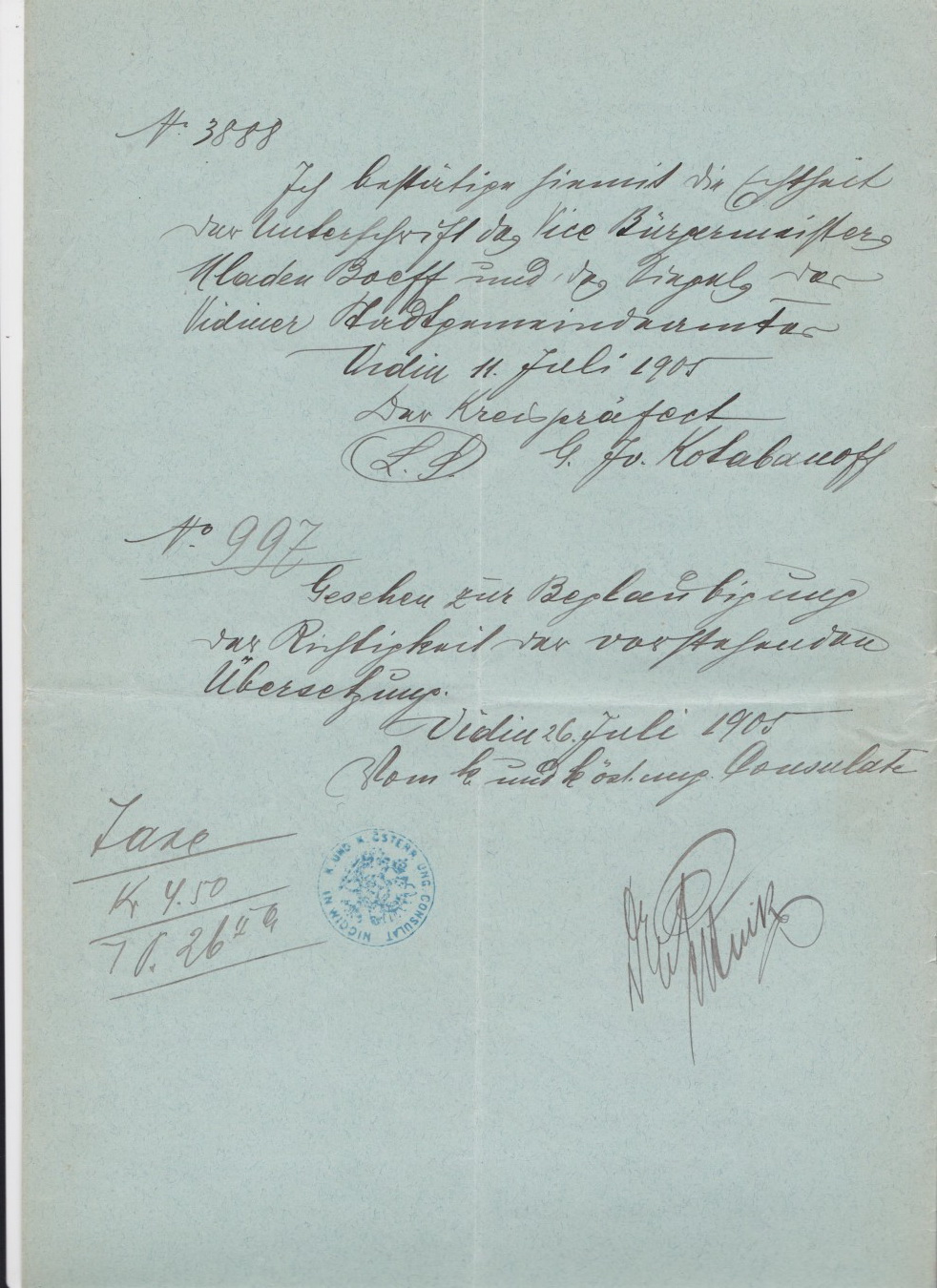 a na kraju overen u austrougarskom konzulatu u Vidinu (26. jula 1905.), da bi