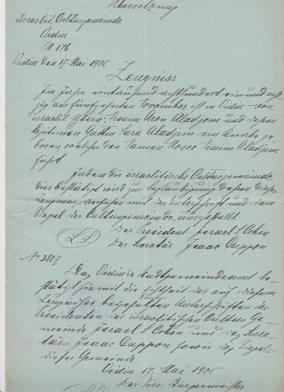 koje je najpre izdato od jevrejske opštine u Vidinu 17. maja 1905. godine.