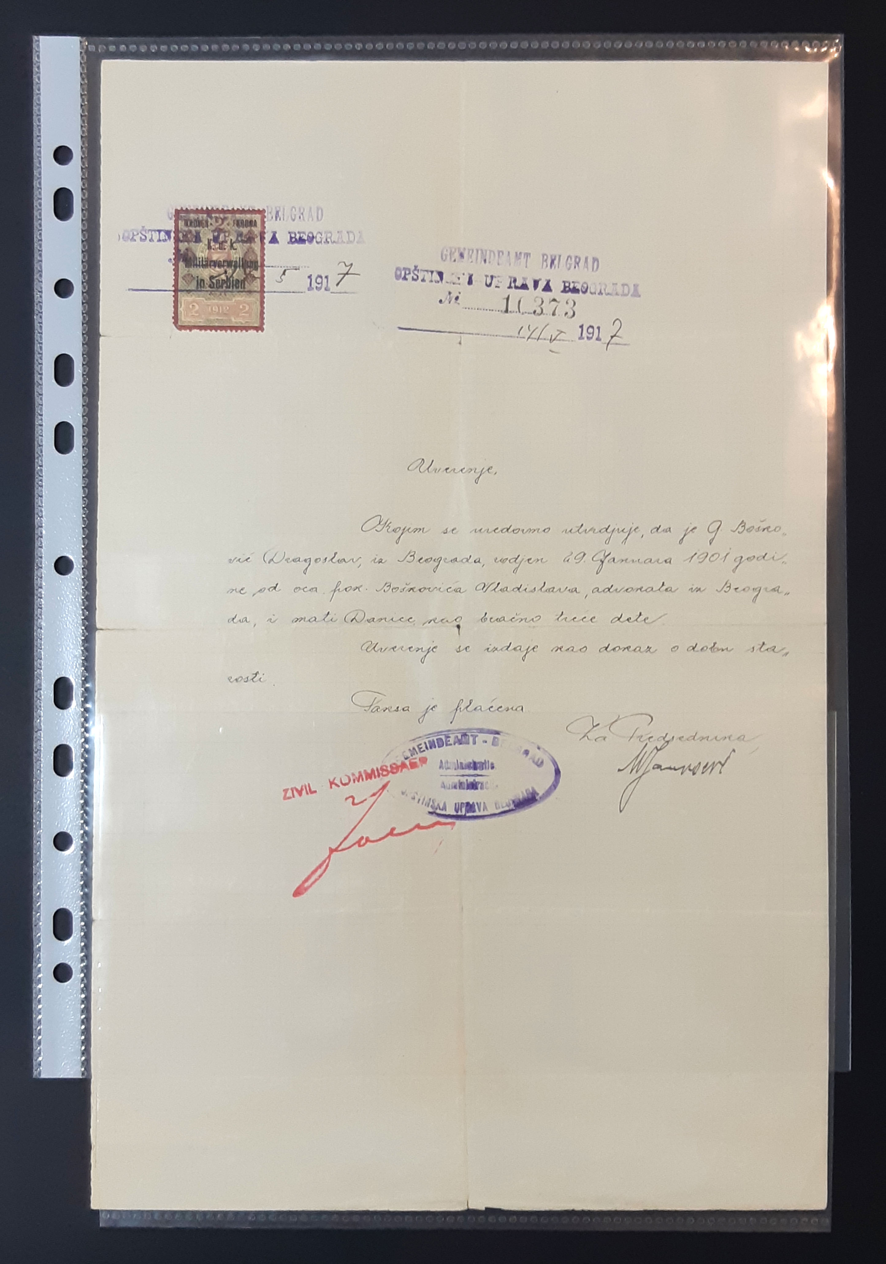Dokument je ručno pisan, potpisani su nadležni, a na njemu su i dve vrste pečata (okupacione) opštinske uprave Beograda,