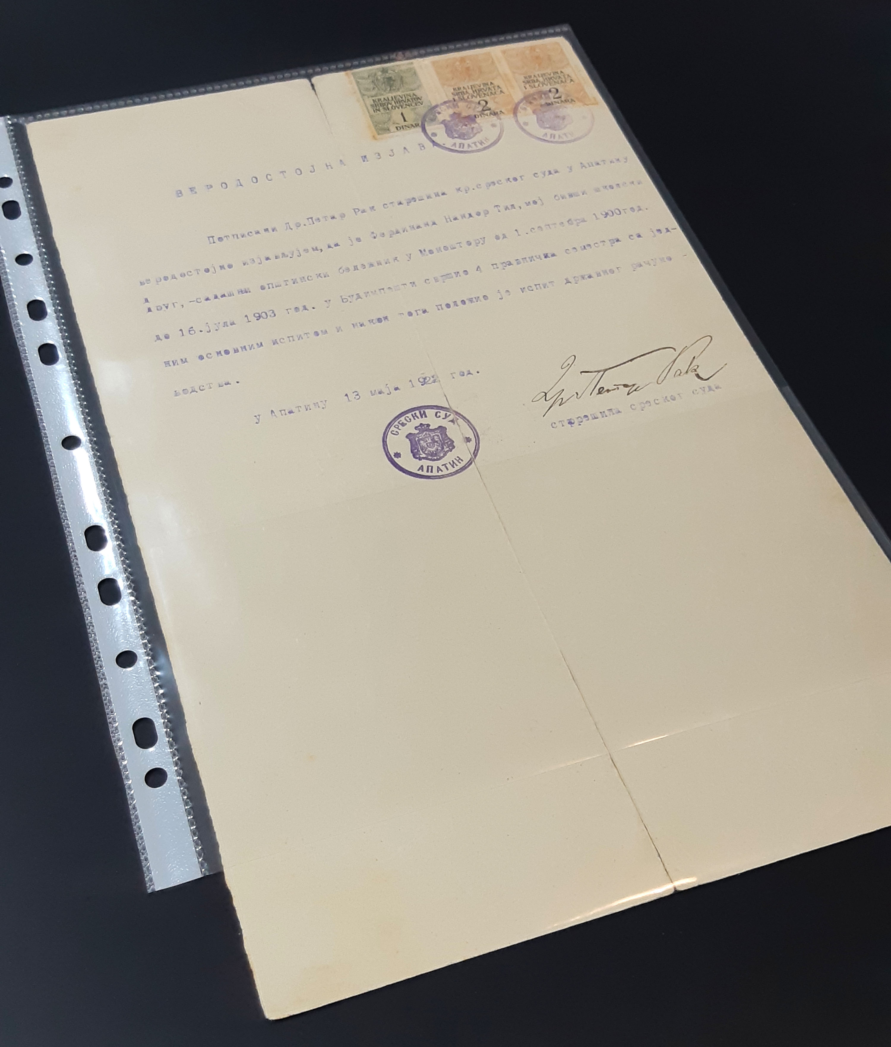 overen od strane suda u Apatinu, sa jasnim pečatima suda,