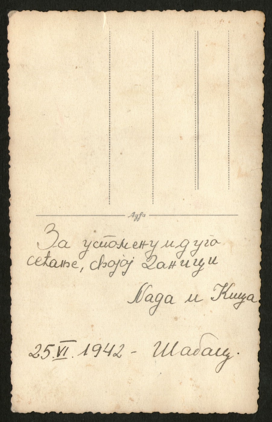 Datum 25. VI 1942. i 'Šabac' sa posvetom su ispisani na zadnjoj strani fotografije.